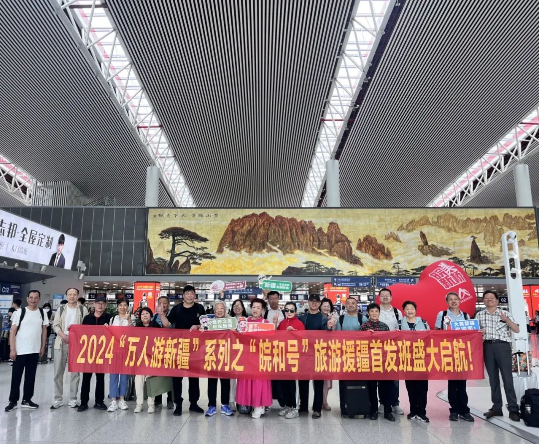 6月18日,“萬人游新疆”系列活動之“皖和號”旅游援疆第五批在合肥火車站啟航,426名旅客分別搭乘航班及火車前往新疆烏魯木齊,開啟精彩的南北疆之旅。